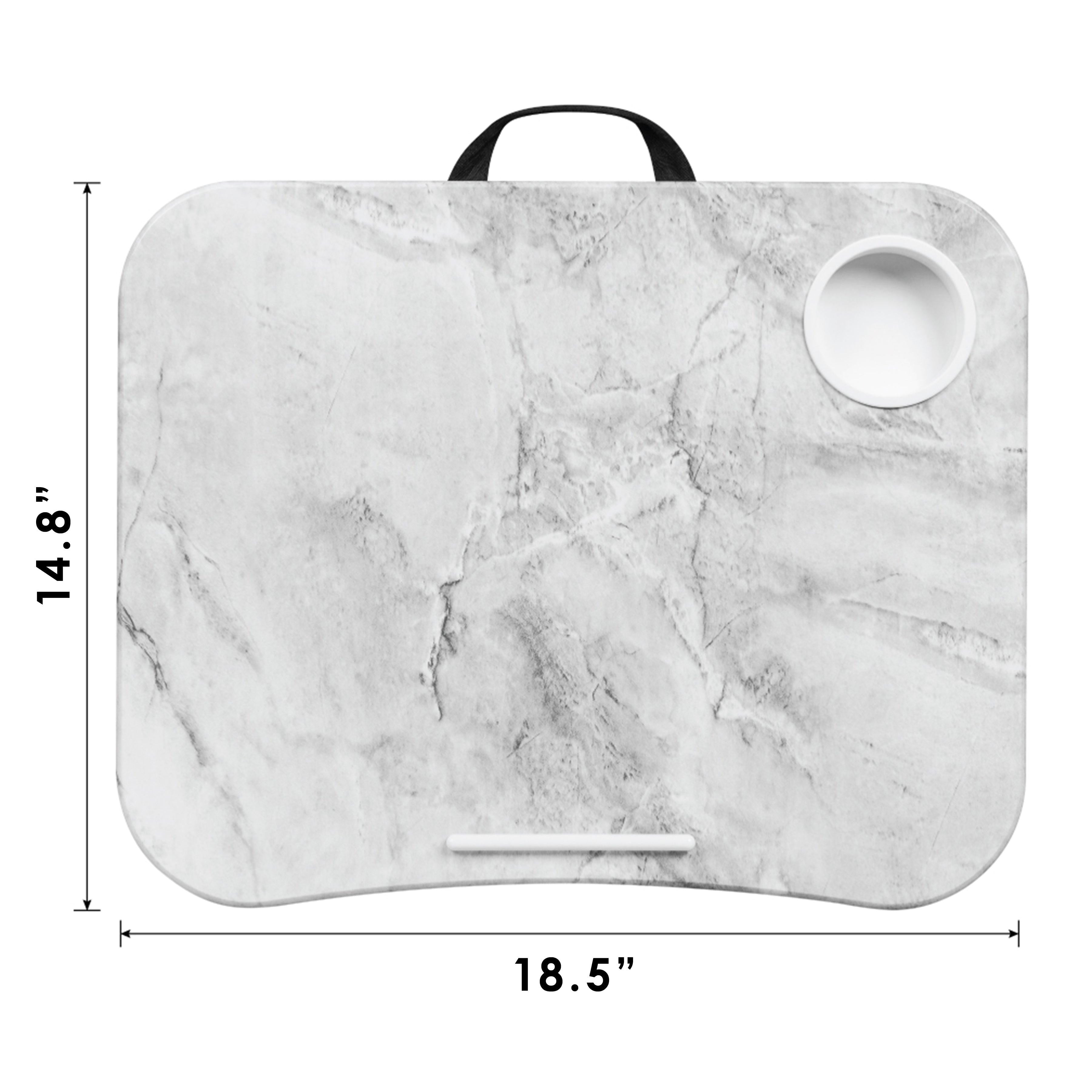 The Cup Holder Lap Desk is the perfect mobile workspace for laptops and other tasks while you enjoy your favorite beverage. The 17.8” x 13.7” surface is a beautiful design, made from durable, lightweight PVC that is easy to keep clean. The soft, microbead-filled cushion conforms comfortably to your lap creating stability while it rests in your lap. Whether you’re working or relaxing, the Cup Holder Lap Desk is the ideal choice for all lifestyles.