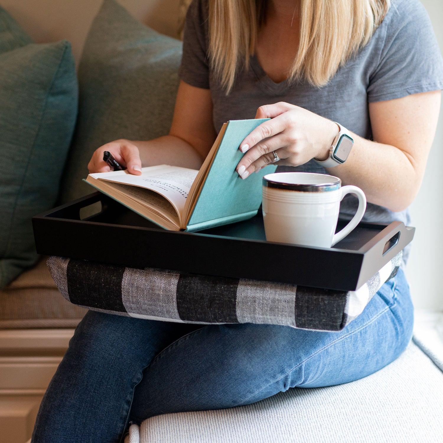 Constructed with a sturdy and sleek design, the conforming cushion will keep you comfortable while working, eating, or giving yourself a manicure. Transition effortlessly from work to meals, or entertaining by easily unbuttoning the machine-washable cushion cover. The cool tones of this tray will complement any hostess’ décor choices, from delicate glassware to colorful pottery, whether serving drinks on the apartment patio or tapas on the townhouse deck.